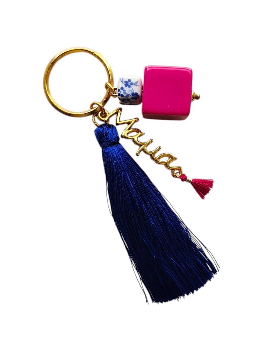 Χειροποίητο μπρελόκ για τη μαμά, σε μπλε και φούξια αποχρώσεις με μεταλλικό διακοσμητικό "μαμά", μπλε φούντα και χάντρες. Δημιουργία της ομάδας του Εθελοντικού Εργαστηρίου του Οργανισμού μας.