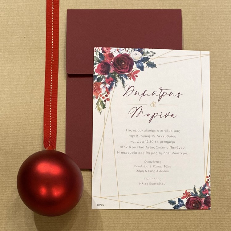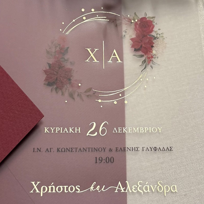 Το προσκλητήριο επιμέλειας συνεργαζόμενου τυπογραφείου τυπώνεται σε ημιδιαφάνεια σε διάσταση 16,5 Χ 23εκ. Στην τιμή συμπεριλαμβάνεται φάκελος σε ματ χαρτί σε χρώμα μπορντό 300γρ με διάσταση 24,5 Χ 17,5εκ. Στην εσωτερική κάρτα εκτός από την απλή εκτύπωση υπάρχει και χρυσοτυπία κειμένου με επιπλέον χρέωση. Εναλλακτικά μπορεί να γίνει όλο με απλή εκτύπωση.