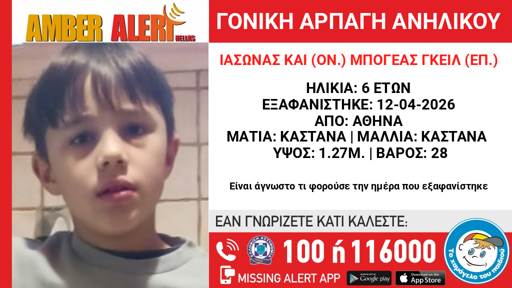 Στις 12/04/2026 ο πατέρας του ανηλίκου προέβη σε αρπαγή του Ιάσωνα Κάι (ον.) Μπογέα Γκέιλ (επ.), 6,5 ετών, από την περιοχή της Βουλιαγμένης Αττικής και έκτοτε αγνοούνται. «Το Χαμόγελο του Παιδιού» προχώρησε στην ενεργοποίηση του μηχανισμού Amber Alert Hellas σήμερα, 13/04/2026, κατόπιν εισαγγελικής εντολής καθώς πιθανόν συντρέχουν λόγοι που θέτουν τη ζωή του ανήλικου σε κίνδυνο.