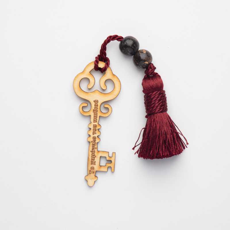 Γούρι ξύλινο κλειδί με χαραγμένο "Το Χαμόγελο του Παιδιού" και μπορντώ φούντα. Διατίθεται σε πουγκάκι. Δημιουργία της ομάδας του Εθελοντικού Εργαστηρίου Αθήνας του Οργανισμού μας.