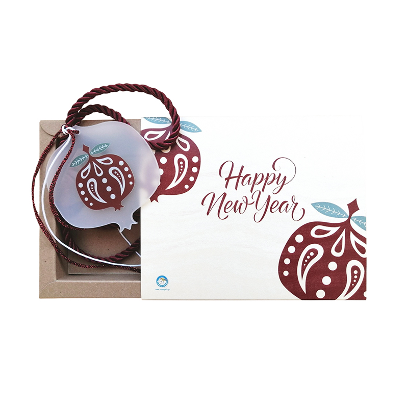 Γούρι - στολίδι με διακοσμητικό plexiglass ρόδι, διακοσμημένο με κορδέλες. Διατίθεται σε χάρτινη κασετίνα με εκτύπωση "Happy New year" και το λογότυπο του Οργανισμού στο εξωτερικό της.