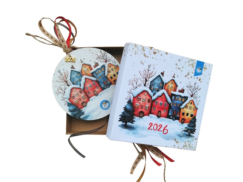 Γούρι στολίδι κρεμαστό, με ξύλινο διακοσμητικό με θέμα χριστουγεννιάτικο χωριό, στολισμένο με κορδέλες σε διάφορα χρώματα και μεταλλικο χρυσό μοτίφ 2026. Διατίθεται σε συσκευασία δώρου. Δημιουργία της ομάδας του Εθελοντικού Εργαστηρίου του Οργανισμού μας.