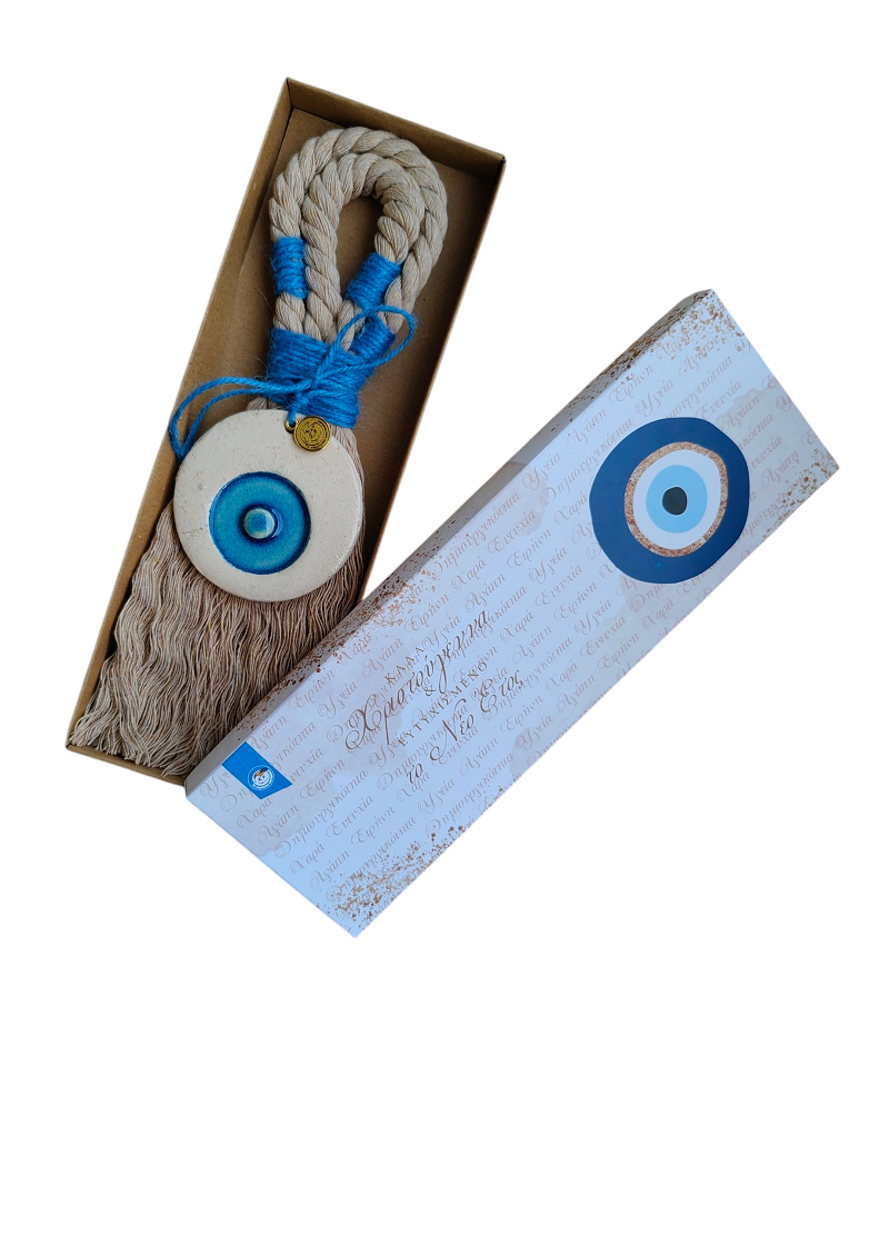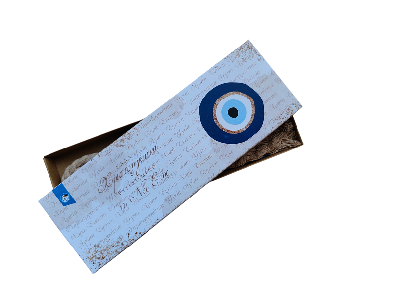 Γούρι στολίδι με πήλινο μάτι, δεμένο με τρίκλωνο κορδόνι και σπάγκο και μεταλλικό στοιχείο με το λογότυπου του Οργανισμού. Διαστάσεις Μάτι: 7 (Π) x 7 (Y) cm. Συνολικό μήκος: 24cm. Το στολίδι διατίθεται σε κουτί εκτυπωμένο με χριστουγεννιάτικο μοτίβο. Το στολίδι είναι κατασκευή του Εθελοντικού Δημιουργικού Εργαστηρίου του Οργανισμού.
