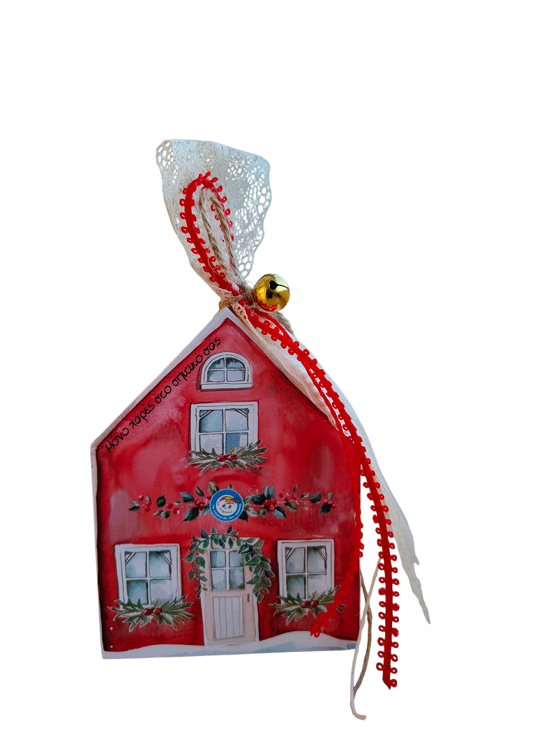 Επιτραπέζιο γούρι ξύλινο σπιτάκι "Μόνο Χαρές Στο Σπιτικό σας". Διακοσμημένο με κορδέλες και κουδουνάκι. Διατίθεται σε κουτί. Δημιουργία της ομάδας του Εθελοντικού Εργαστηρίου του Οργανισμού μας.