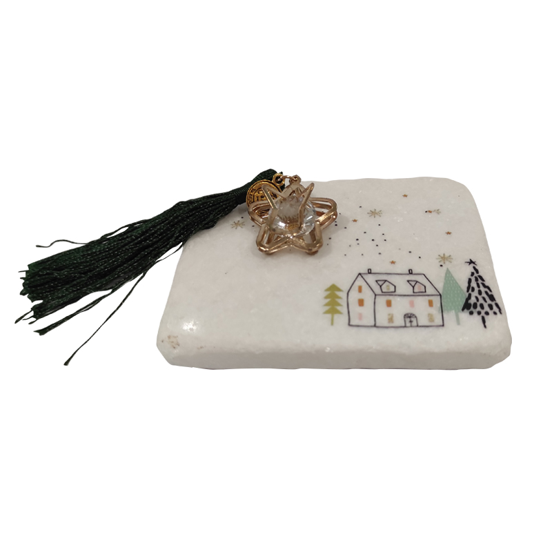 Γούρι σε πέτρα με πράσινη φούντα και ζωγραφιά σπιτάκι. Διατίθεται σε κουτί. Διαστάσεις: 7x9 cm