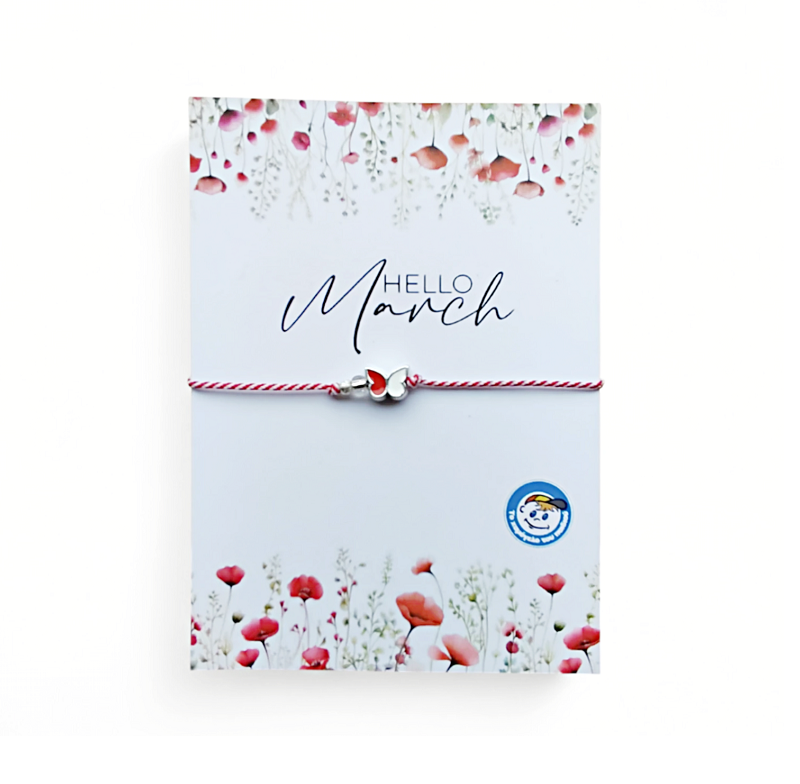 Χειροποίητο μαρτιάτικο βραχιολάκι με διακοσμητική μεταλλική Πεταλούδα. Το βραχιολάκι διατίθεται δεμένο σε καρτελάκι με το μήνυμα "Hello March" και το λογότυπο του Οργανισμού. Στην πίσω όψη θα βρείτε την ιστορία του εθίμου. Το βραχιολάκι είναι συσκευασμένο σε διάφανο σακουλάκι. Δημιουργία της ομάδας εθελοντών του Δημιουργικού Εργαστηρίου.