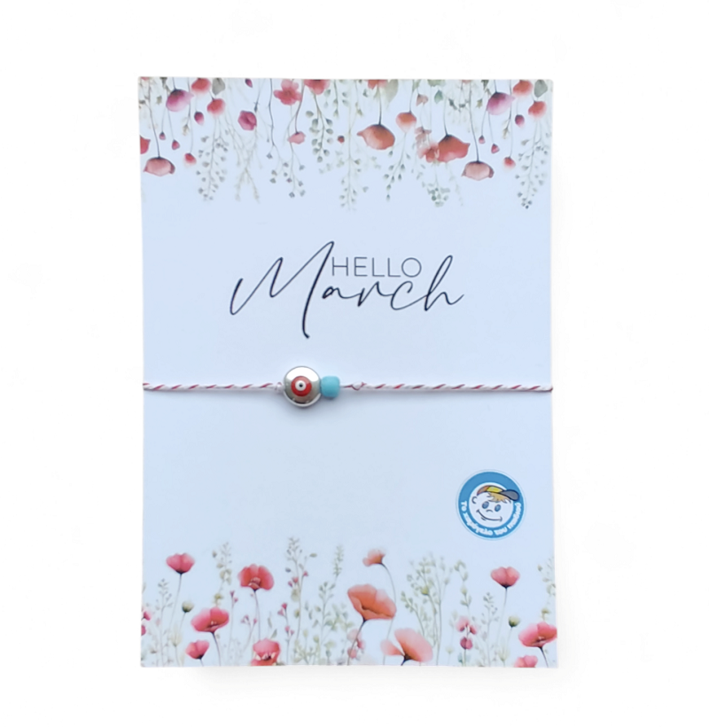 Χειροποίητο μαρτιάτικο βραχιολάκι με γαλάζια χαντρούλα και κόκκινο ματάκι. Το βραχιολάκι διατίθεται δεμένο σε καρτελάκι με το μήνυμα "Hello March" και το λογότυπο του Οργανισμού. Στην πίσω όψη θα βρείτε την ιστορία του εθίμου. Το βραχιολάκι είναι συσκευασμένο σε διάφανο σακουλάκι. Δημιουργία της ομάδας εθελοντών του Δημιουργικού Εργαστηρίου.