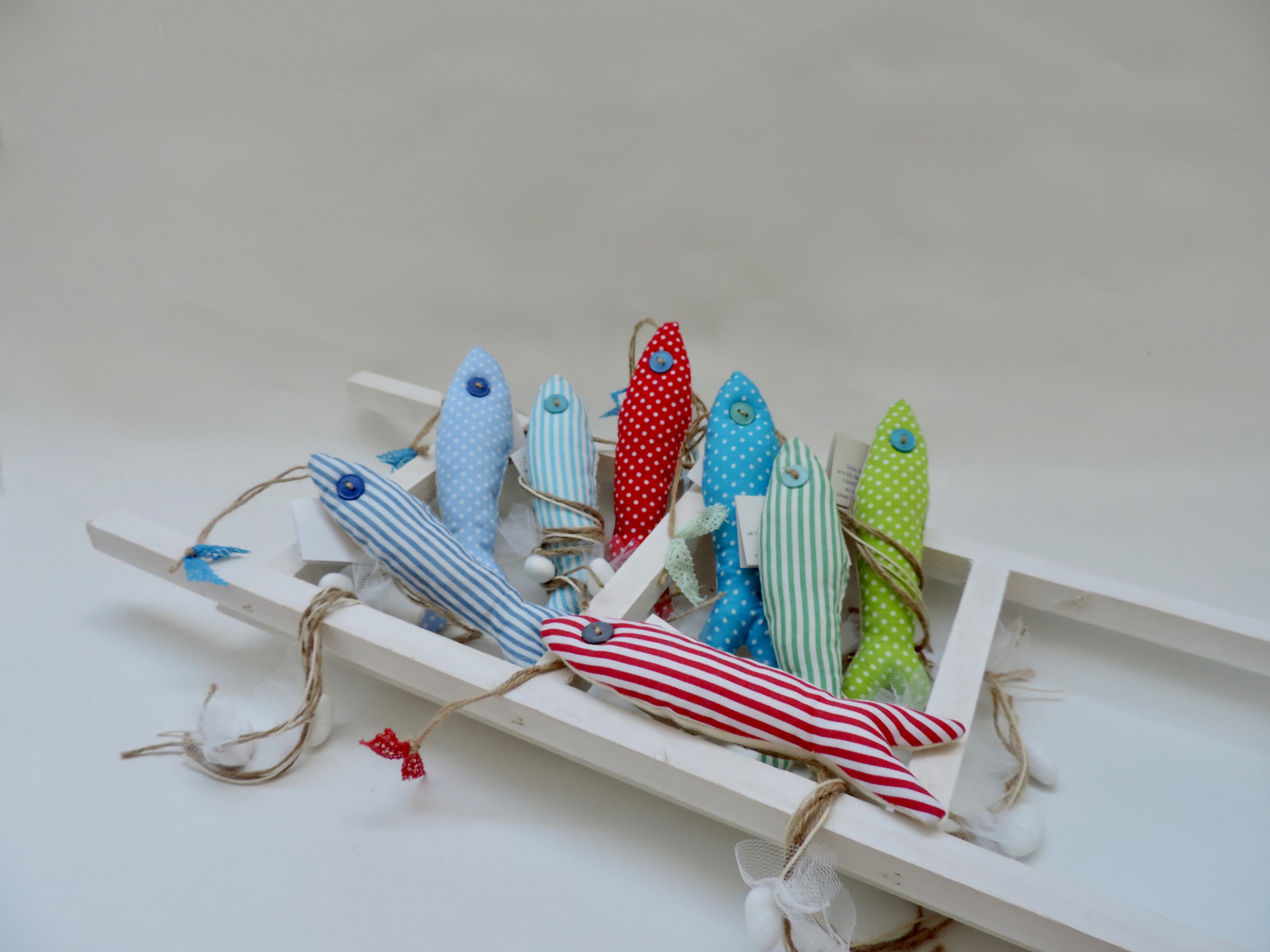 Μπομπονιέρα βάπτισης φουσκωτό υφασμάτινο χειροποίητο ψαράκι. Διατίθεται σε ριγέ λευκό – κόκκινο, ριγέ λευκό τυρκουάζ, ριγέ λευκό-σιελ, ριγέ λευκό-πράσινο, πουά κόκκινο, πουά σιελ, πουά λαχανί και πουά τυρκουάζ αποχρώσεις. Υπάρχει δυνατότητα επιλογής ενός ή περισσοτέρων χρωμάτων. Περιλαμβάνει 3 κουφέτα αμυγδάλου ή 3 σοκολατένιες καρδούλες.