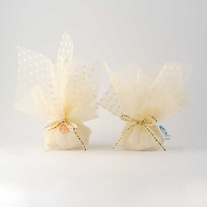 Μπομπονιέρα γάμου τούλι κεντητό πουά 38Χ38 σε λευκό ή ιβουάρ χρώμα δεμένο με κορδελάκι ενός εκατοστού σατεν σε χρώμα της επιλογής σας.