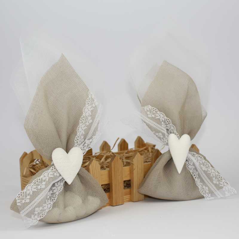 Μπομπονιέρα γάμου διπλωτή με αρωματική ακρυλική καρδιά. Αποτελείται από δυο φύλλα τούλι Γαλλικό 40X40 και ένα φύλλο γάζας 30Χ30, δεμένα με δαντελίτσα. Περιέχει 7 κουφέτα αμυγδάλου ή καρδιές σοκολάτας