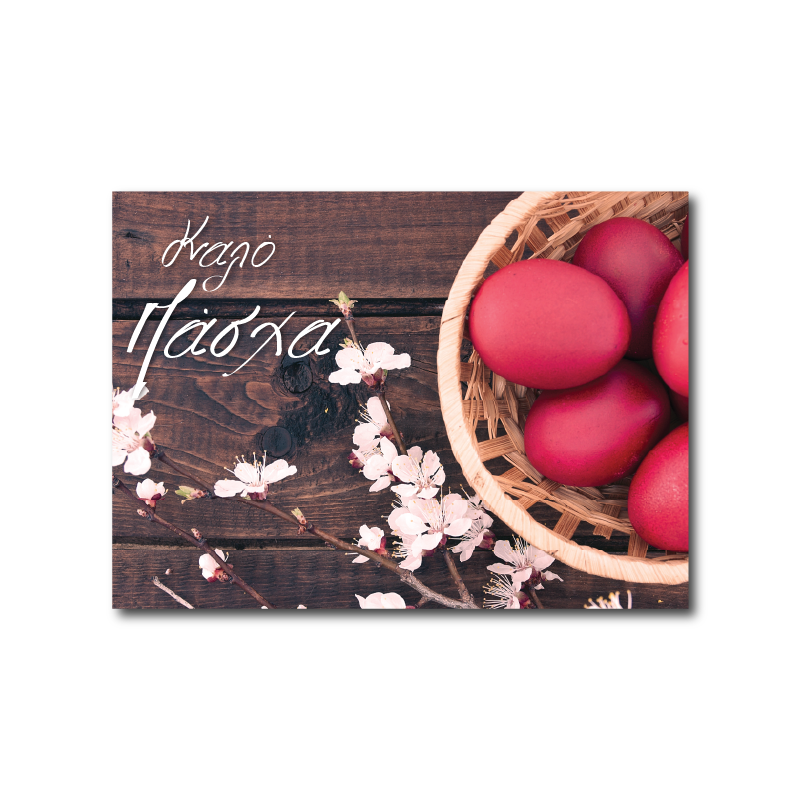 Ευχετήρια κάρτα για το Πάσχα. Η κάρτα είναι δίφυλλη με διάσταση 12 Χ 16,8 εκ. (κλειστή) και είναι εκτυπωμένη σε χαρτί velvet 300 γραμμαρίων. Κενή εσωτερικά για να γράψετε τις δικές σας ευχές. Περιλαμβάνεται λευκός φάκελος.