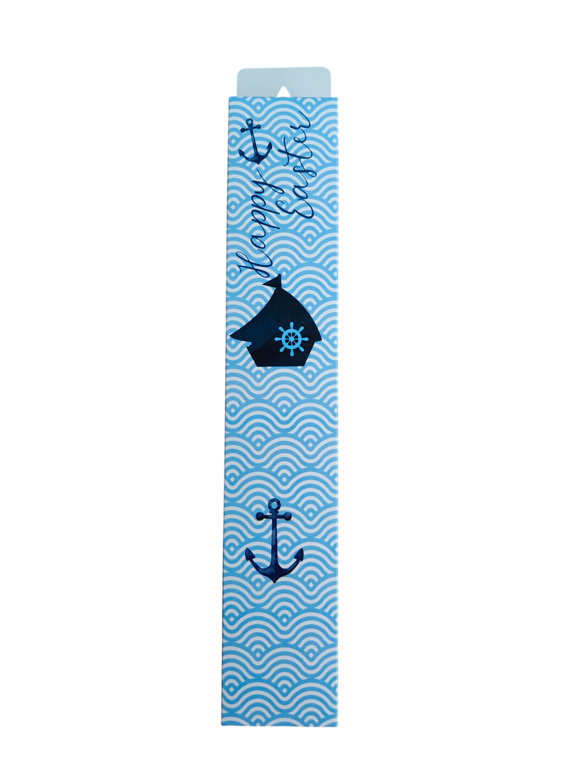 Πασχαλινή λαμπάδα σε λευκό τετράγωνο αρωματικό κερί  με εκτυπωμένο χάρτινο εικαστικό με θέμα θάλασσα και με τσόχινο διακοσμητικό καραβάκι. Στολισμένη με κορδέλες σε λευκές και μπλε αποχρώσεις.  Η λαμπάδα είναι δημιουργία της ομάδας εθελοντών του  Εργαστηρίου του Οργανισμού μας. Διατίθεται σε λαμπαδόκουτο.