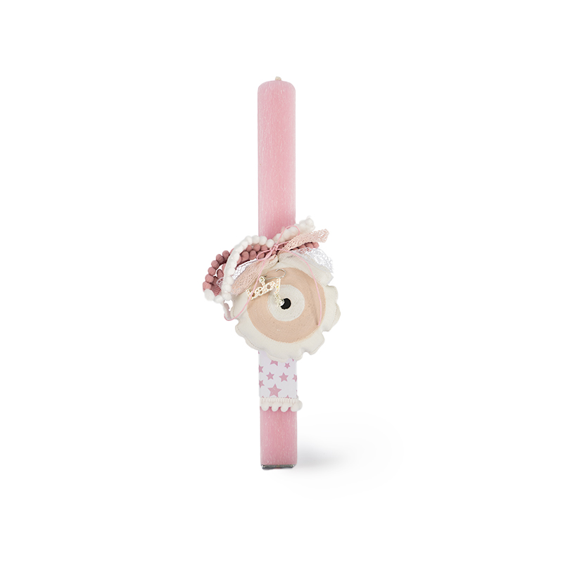 Χειροποίητη πασχαλινή λαμπάδα σε ροζ αρωματικό κερί με εκτυπωμένο εικαστικό, κορδέλα με πον πον και δαντέλα, φυλαχτό μαξιλαράκι μάτι. Ύψος 30 εκατοστά. Η λαμπάδα είναι δημιουργία της ομάδας εθελοντών του Εργαστηρίου του Οργανισμού μας. Διατίθεται σε λαμπαδόκουτο.