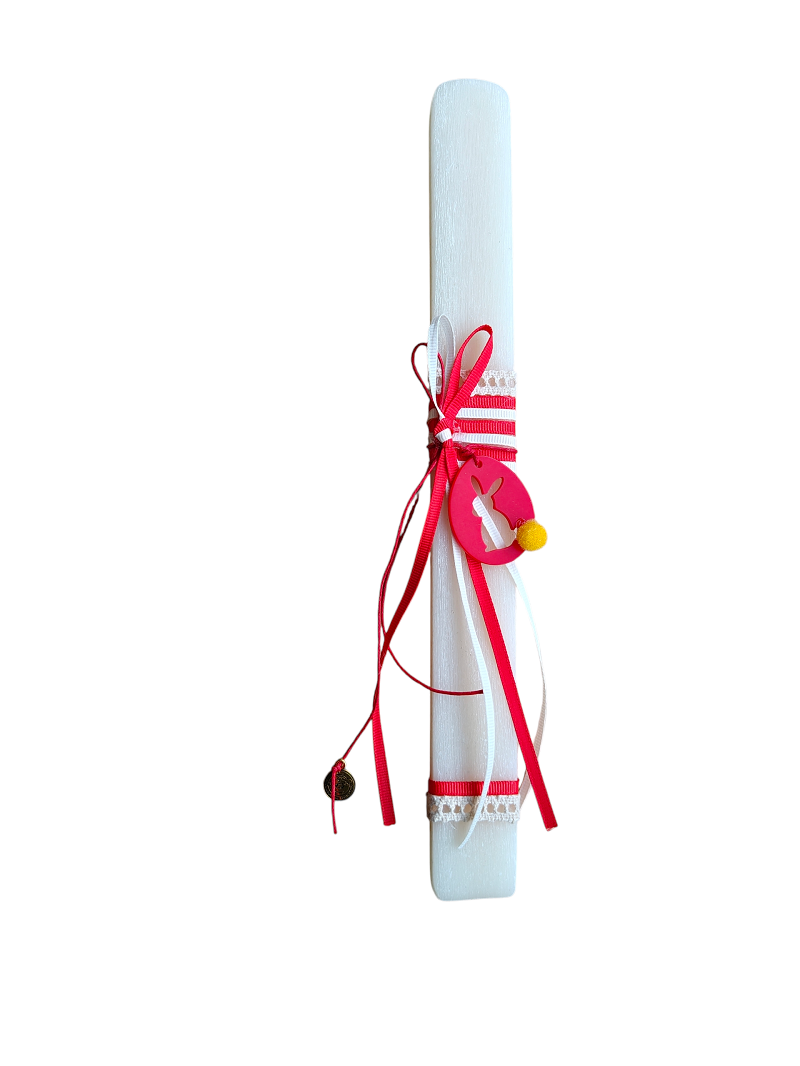 Χειροποίητη πασχαλινή λαμπάδα σε εκρού πλακέ αρωματικό κερί με διακοσμητικό κόκκινο αυγό με λαγουδάκι, στολισμένη με κορδέλες και το λογότυπο του Οργανισμού.  Η λαμπάδα είναι δημιουργία της ομάδας εθελοντών του  Εργαστηρίου του Οργανισμού μας. Διατίθεται σε λαμπαδόκουτο.