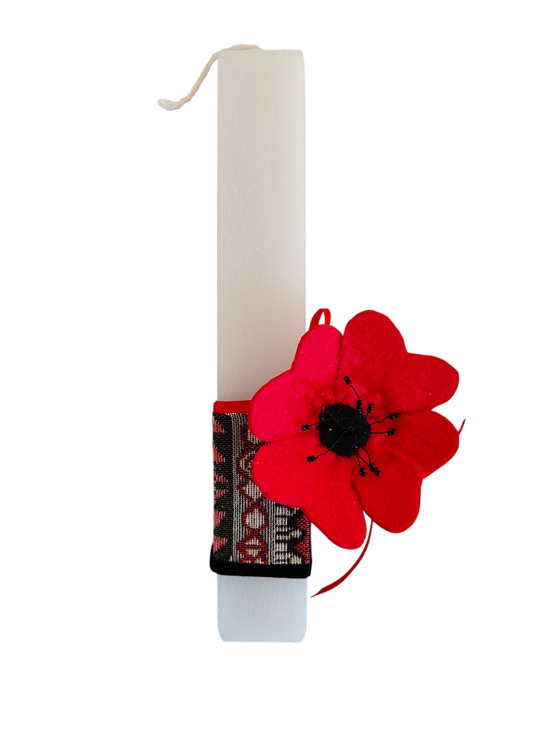 Χειροποίητη πασχαλινή λαμπάδα σε λευκό πλακέ αρωματικό κερί με διακοσμητική χειροποίητη καρφίτσα παπαρούνα. Η λαμπάδα είναι δημιουργία της ομάδας εθελοντών του  Εργαστηρίου του Οργανισμού μας. Διατίθεται σε λαμπαδόκουτο.