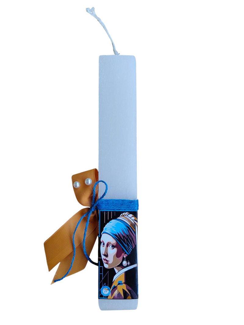 Χειροποίητη πασχαλινή λαμπάδα σε λευκό πλακέ αρωματικό κερί εμπνευσμένη από τον πίνακα του ολλανδού ζωγράφου Johannes Vermeer "Το Κορίτσι Με Το Μαργαριταρένιο Σκουλαρίκι". Με ένα ζευγάρι σκουλαρίκια, τεχνική ντεκουπάζ και διακοσμητικές κορδέλες. Η λαμπάδα είναι δημιουργία της ομάδας εθελοντών του Εργαστηρίου του Οργανισμού μας. Διατίθεται σε λαμπαδόκουτο.