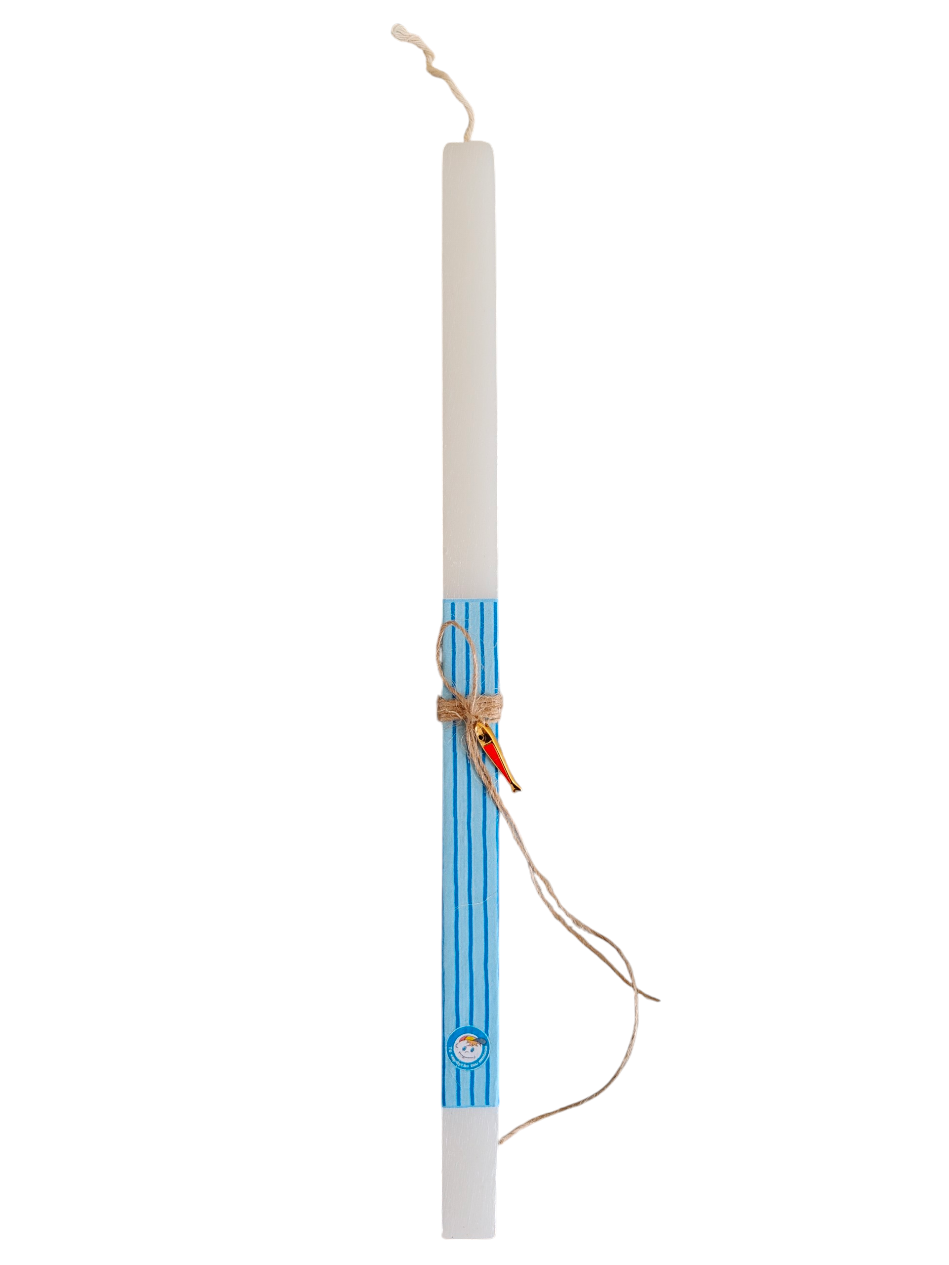 Πασχαλινό λαμπαδάκι σε τετράγωνο λευκό αρωματικό κερί με τεχνική ντεκουπάζ και μεταλλικό ψαράκι, δεμένο σε σπάγγο. Η λαμπάδα είναι δημιουργία της ομάδας εθελοντών του  Εργαστηρίου του Οργανισμού μας. Διατίθεται σε λαμπαδόκουτο.