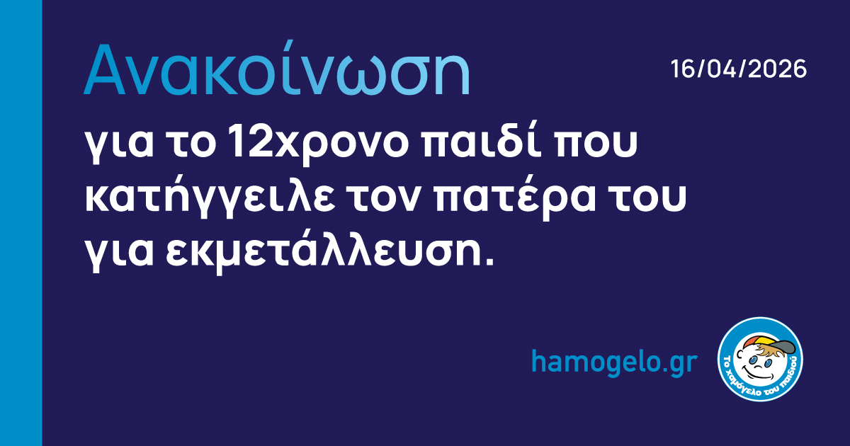 Σε συνέχεια δημοσιευμάτων https://www.npress.gr/greece/patra-12chronos-katingeile-ton-patera-tou-gia-ekmetallefsi-epi-dyo-chronia/, βάσει των οποίων 12χρονο παιδί κατήγγειλε τον πατέρα του για εκμετάλλευση, «Το Χαμόγελο του Παιδιού» ενημερώνει ότι: