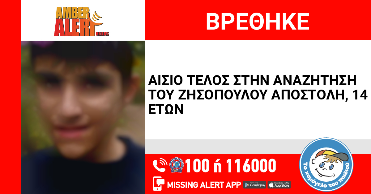 Στις 20/12/2024 πρώτες πρωινές ώρες, ο Ζησόπουλος Αποστόλης, 14 ετών, επέστρεψε στην οικία του. Το παιδί είναι καλά στην υγεία του και λαμβάνει την φροντίδα που χρειάζεται