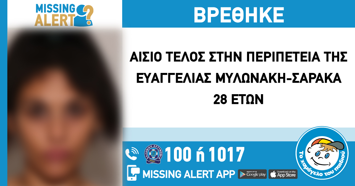 Η περιπέτεια της Ευαγγελίας Μυλωνάκη- Σάρακα, 28 ετών, έληξε σήμερα 12/1/2026, δίνοντας τέλος στην αγωνία των δικών της ανθρώπων που την αναζητούσαν. Η Ευαγγελία Μυλωνάκη – Σάρακα βρέθηκε και είναι καλά στην υγεία της.