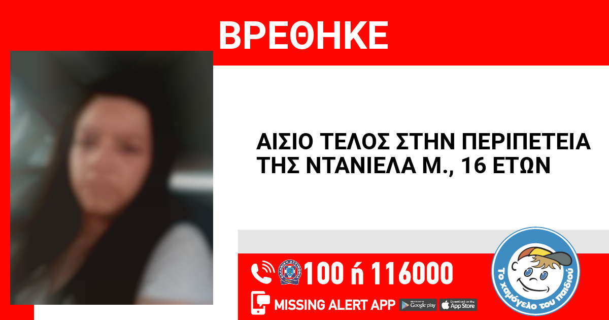 Η περιπέτεια της Ντανιέλα Μ., 16 ετών, έληξε σήμερα, 27/11/2025 δίνοντας τέλος στην αγωνία των δικών της ανθρώπων που την αναζητούσαν. Η Ντανιέλα Μ., 16 ετών εντοπίστηκε από τις Αστυνομικές Αρχές στην περιοχή της Δάφνης, είναι καλά στην υγεία της και λαμβάνει τη φροντίδα που χρειάζεται. Τα αίτια της εξαφάνισής της διερευνώνται από τις αρμόδιες Αρχές.