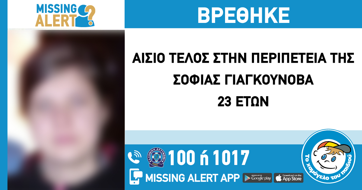 Υπενθυμίζουμε ότι η Σοφία Γιαγκούνοβα, 23 ετών, είχε εξαφανιστεί στις 20/10/25 από την περιοχή των Γρεβενών. «Το Χαμόγελο του Παιδιού» είχε ενημερωθεί για την εξαφάνισή της στις 21/10/25 και είχε προχωρήσει στη δημοσιοποίηση των στοιχείων της ενήλικης, κατόπιν αιτήματος της οικογένειας της.