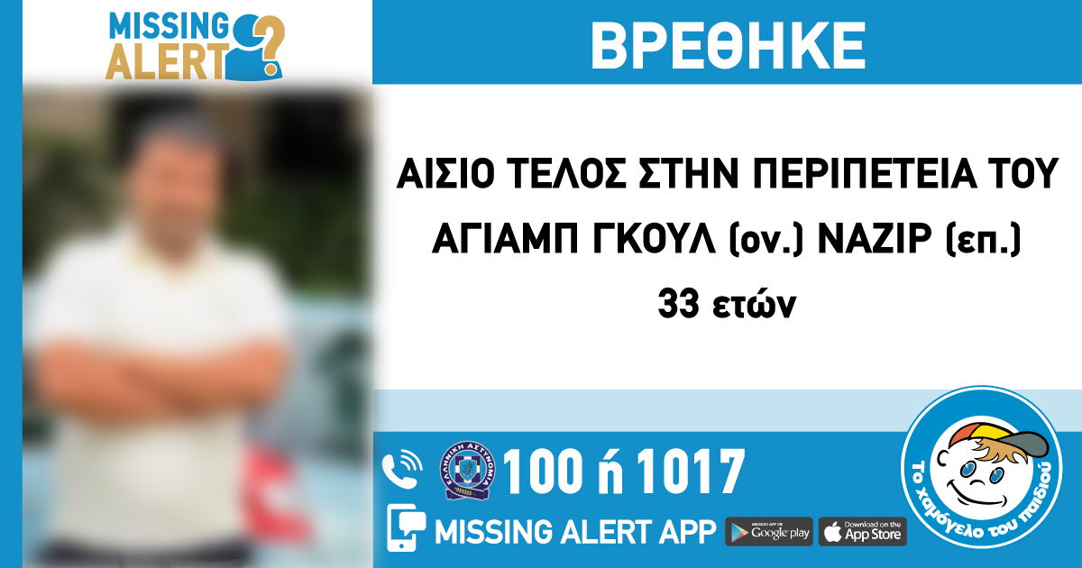 Να υπενθημίσουμε ότι ο Αγιάμπ Γκουλ (ον.) Ναζίρ (επ.), 33 ετών, εξαφανίστηκε από την περιοχή του Χαϊδαρίου Αττικής. «Το Χαμόγελο του Παιδιού» ενημερώθηκε για την εξαφάνιση του στις 22/09/2024, και προχώρησε στη δημοσιοποίηση των στοιχείων του ενήλικα, κατόπιν αιτήματος της οικογένειας του, καθώς ενδέχεται να συντρέχουν λόγοι οι οποίοι θέτουν τη ζωή του σε κίνδυνο.