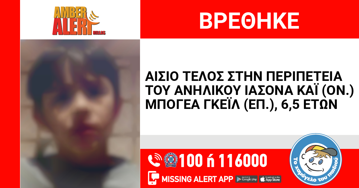 Αίσιο τέλος είχε η περιπέτεια του Ιάσονα Κάι (ον.) Μπογέα Γκέιλ (επ.), 6,5 ετών, που στις 12/4/2026 εξαφανίστηκε από την περιοχή της Βουλιαγμένης, μετά από αρπαγή στην οποία προέβη ο πατέρας του. Το παιδί εντοπίστηκε από αστυνομικούς του τμήματος που ανέλαβε την υπόθεση στην περιοχή της Γλυφάδας και είναι καλά στην υγεία του.