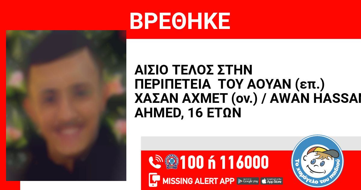 Η περιπέτεια του Αουάν Χασάν Αχμέτ (Awan Hassan Ahmed), 16 ετών, έληξε σήμερα 30/11/25 δίνοντας τέλος στην αγωνία των δικών του ανθρώπων που τον αναζητούσαν. Ο Αουάν Χασάν Αχμέτ (Awan Hassan Ahmed), βρέθηκε στην περιοχή της Αθήνας και είναι καλά στην υγεία του.