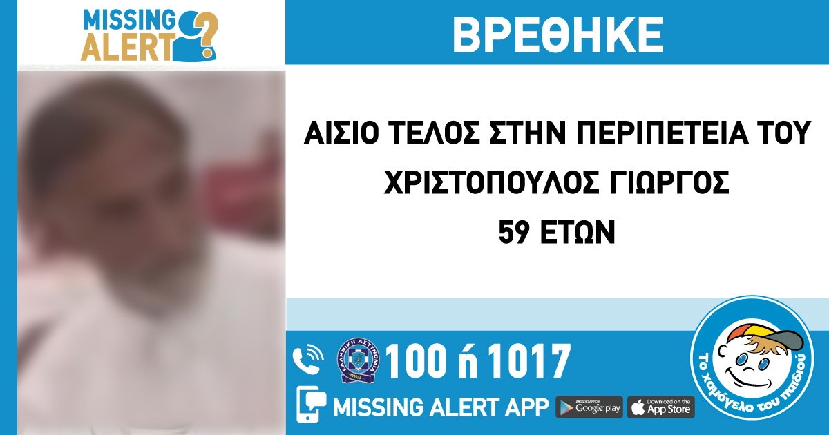 Η περιπέτεια του Γιώργου Χριστόπουλου, 59 ετών, έληξε, δίνοντας τέλος στην αγωνία των δικών του ανθρώπων που τον αναζητούσαν. Ο Γιώργος Χριστόπουλος βρέθηκε και είναι καλά στην υγεία του.