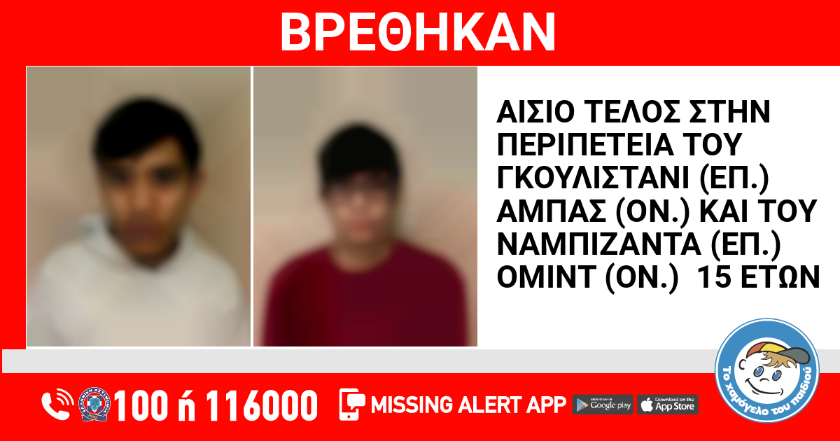 Η περιπέτεια του Γκουλιστάνι (επ.) Αμπάς (ον.), 15 ετών και του Ναμπιζάντα (επ.) Ομίντ (ον.), 15 ετών έληξε, καθώς τα παιδιά εντοπίστηκαν και είναι καλά στην υγεία τους. Σήμερα, 04/02/2026 «Το Χαμόγελο του Παιδιού» ενημερώθηκε από τις Αστυνομικές Αρχές ότι, οι ανήλικοι εντοπίστηκαν στις 03/02/2026 στην περιοχή του Κιλκίς.
