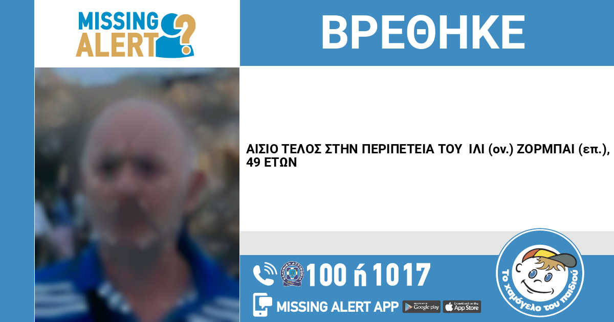 Υπενθυμίζουμε ότι στις 06/10/2025, ο Ίλι (ον.) Ζορμπάι (επ.), 49 ετών, εξαφανίστηκε από την περιοχή του Ριζόμυλου Αχαΐας. «Το Χαμόγελο του Παιδιού» ενημερώθηκε στις 09/10/2025, για την εξαφάνιση του Ίλι (ον.) Ζορμπάι (επ.), και προχώρησε στη δημοσιοποίηση των στοιχείων του ενήλικα κατόπιν αιτήματος της οικογένειας του.