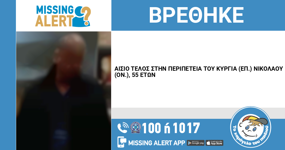 Η περιπέτεια του Κύργια Νικολάου, 55 ετών, έληξε σήμερα 27/10/2025, δίνοντας τέλος στην αγωνία των δικών του ανθρώπων που τον αναζητούσαν. Ο Κύργιας Νικόλαος βρέθηκε και είναι καλά στην υγεία του.