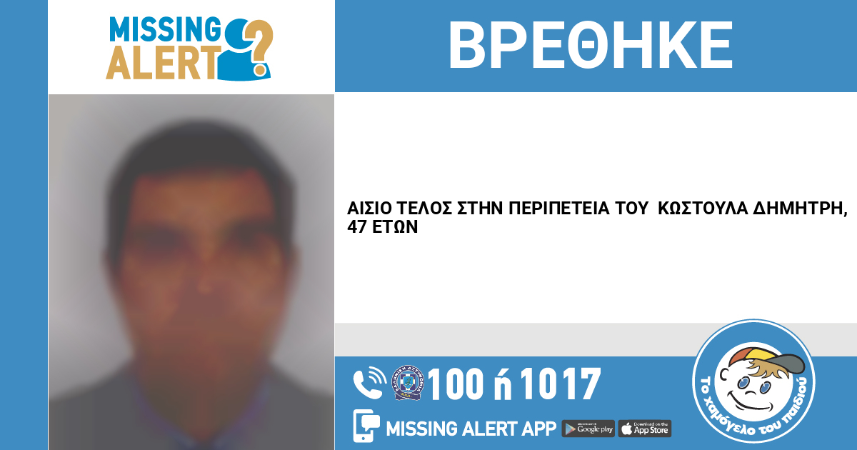 Υπενθυμίζουμε ότι στις 7/10/2025 εξαφανίστηκε από την περιοχή της Κυψέλης ο Κωστούλας Δημήτρης, 47 ετών. «Το Χαμόγελο του Παιδιού» ενημερώθηκε για την εξαφάνιση του και προχώρησε στη δημοσιοποίηση των στοιχείων του, κατόπιν αιτήματος της οικογένειας του, καθώς συνέτρεχαν λόγοι οι οποίοι έθεταν τη ζωή του σε κίνδυνο. Αξίζει να σημειωθεί ότι για την εύρεση του ενήλικα ενεργοποιήθηκε άμεσα η Ομάδα Έρευνας και Διάσωσης του Οργανισμού «Θανάσης Μακρής» και η Ομάδα Διαχείρισης Κρίσεων (Ο.ΔΙ.Κ.).