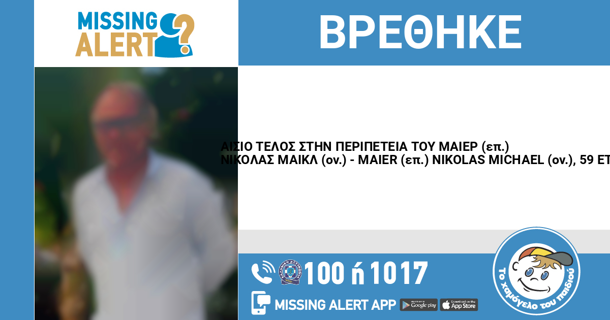 Η περιπέτεια του Μάιερ (επ.) Νίκολας Μάικλ (επ.)- Maier (επ.) Nikolas Michael (ον.),59 ετών, έληξε σήμερα 22/01/2025, δίνοντας τέλος στην αγωνία των δικών του ανθρώπων που τον αναζητούσαν. Ο Μάιερ (επ.) Νίκολας Μάικλ (επ.) βρέθηκε και είναι καλά στην υγεία του.