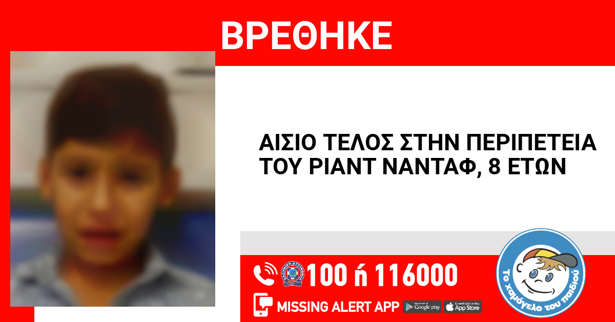 Η περιπέτεια του Ριάντ Ναντάφ, 8 ετών, έληξε δίνοντας τέλος στην αγωνία των δικών του ανθρώπων που τον αναζητούσαν. Συγκεκριμένα, σήμερα 22/1/26 ενημερώθηκε το «Χαμόγελο του Παιδιού» κατόπιν σχετικής εισαγγελικής εντολής ότι ο ανήλικος είναι καλά και έχει επανενωθεί με τους οικείους του στο εξωτερικό.