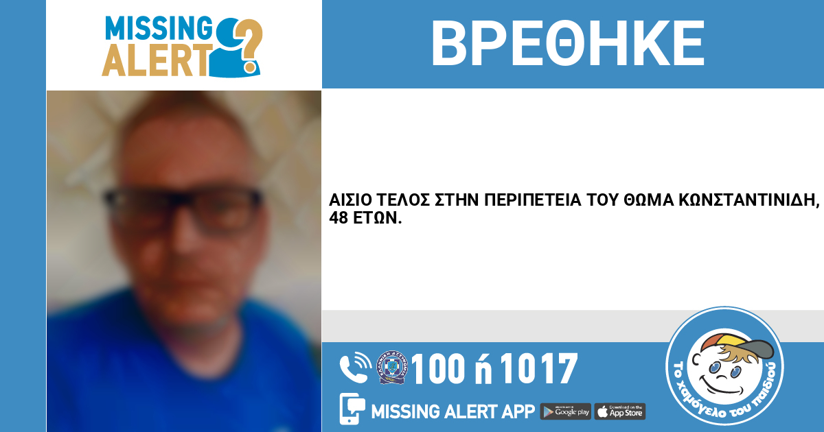 Η περιπέτεια του Θωμά Κωνσταντινίδη, 48 ετών, έληξε σήμερα 28/04/2026 δίνοντας τέλος στην αγωνία των δικών του ανθρώπων που τον αναζητούσαν. Συγκεκριμένα, ο ενήλικας εντοπίστηκε από αστυνομικούς της Άμεσης Δράσης Θεσσαλονίκης, οι οποίοι είχαν ενημερωθεί για την εξαφάνισή του μέσω του μηχανισμού Missing Alert.