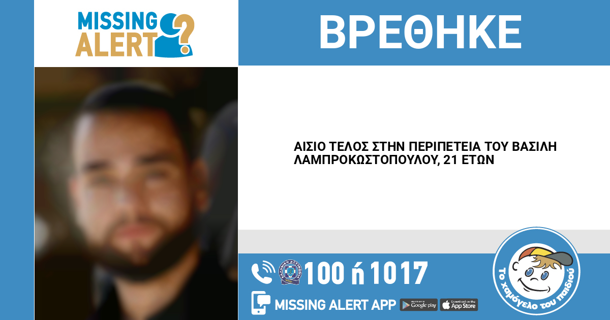 Η περιπέτεια του Βασίλη Λαμπροκωστόπουλου έληξε σήμερα στις 28/03/2026, δίνοντας τέλος στην αγωνία των δικών του ανθρώπων που τον αναζητούσαν. Ο ενήλικας εντοπίστηκε και είναι καλά στην υγεία του.