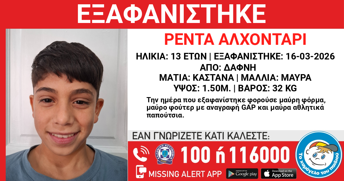 Στις 16/3/2026 , εξαφανίστηκε χώρο φιλοξενίας ασυνόδευτων ανηλίκων στην Δάφνη Αττικής, ο Reda (ΟΝ) Alkhodary (ΕΠ.). Το «Χαμόγελο του Παιδιού» ενημερώθηκε σήμερα, 17/03/2026, για την εξαφάνισή του και προχώρησε άμεσα στη δημοσιοποίηση των στοιχείων του, καθώς ενδέχεται να συντρέχουν λόγοι που θέτουν τη ζωή του σε κίνδυνο.