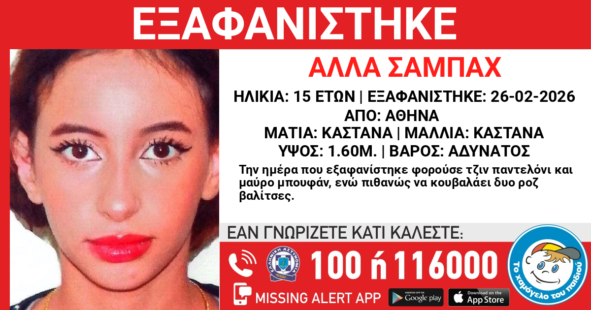 Στις 26/02/2026, πρωινές ώρες, εξαφανίστηκε από χώρο φιλοξενίας ασυνόδευτων ανηλίκων στην περιοχή της Αθήνας, η Άλλα (ον.) Σαμπάχ (επ.), 15 ετών, παλαιστινιακής καταγωγής. «Το Χαμόγελο του Παιδιού» ενημερώθηκε σήμερα, 26/02/26, και προχώρησε σε δημοσιοποίηση των στοιχείων της ανήλικης καθώς ενδεχομένως να συντρέχουν λόγοι που θέτουν την ζωή της σε κίνδυνο.