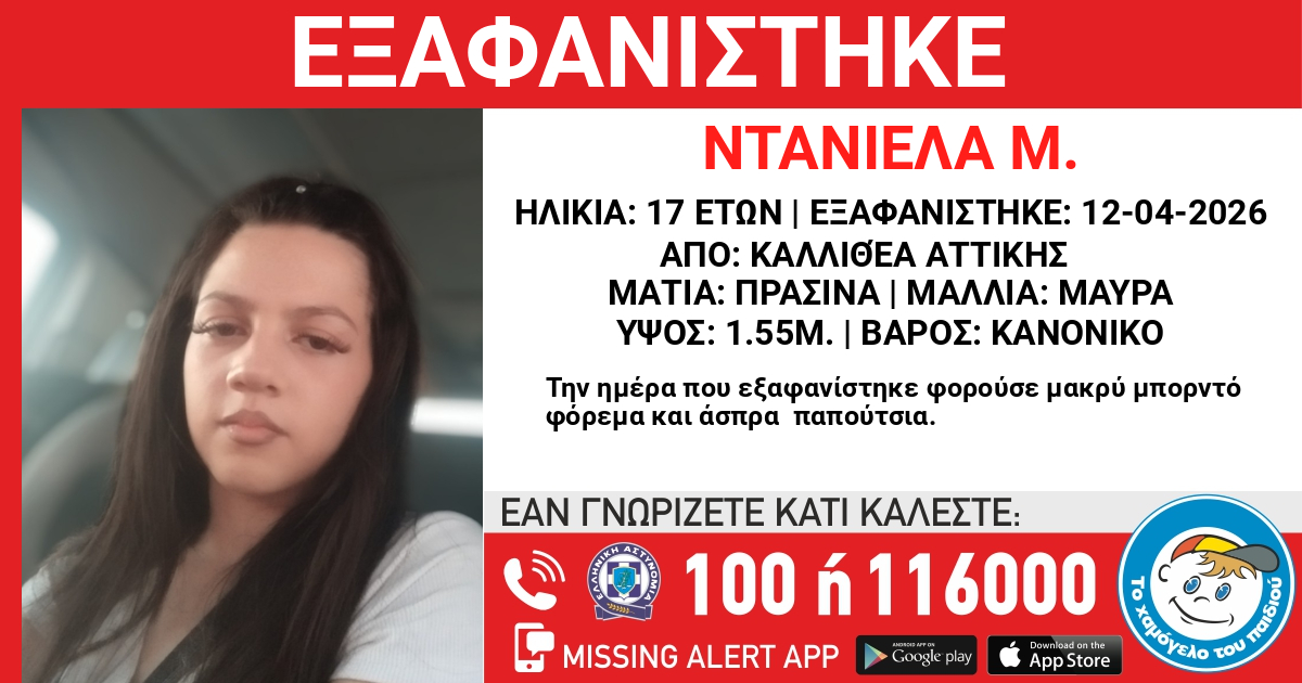 Στις 12/04/2026, στις 17:00μμ, εξαφανίστηκε από την Καλλιθέα Αττικής η Ντανιέλα Μ., 17 ετών. Το «Χαμόγελο του Παιδιού» ενημερώθηκε για την εξαφάνιση της ανήλικης σήμερα, 29/04/2026, και προχώρησε στη δημοσιοποίηση των στοιχείων της κατόπιν αιτήματος της οικογένειας της, καθώς ενδέχεται να συντρέχουν λόγοι που θέτουν τη ζωή της σε κίνδυνο.