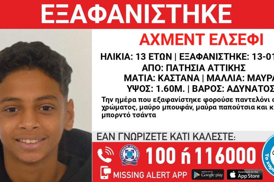 Στις 13/01/2025, και ώρα 08.15, εξαφανίστηκαν οι ανήλικοι Αλζακαρία (επ) Ομάρ (ον.) 3 ετών και ο Αλζακαρία Μουχάμεντ Αμίν (ον.) 5 ετών, από τον Άγιο Παντελεήμονα Αττικής και έκτοτε αγνοούνται. «Το Χαμόγελο του Παιδιού» ενημερώθηκε για την εξαφάνιση των ανήλικων και προχώρησε σήμερα 22/01/2025 κατόπιν εισαγγελικής εντολής  στην ενεργοποίηση του μηχανισμού AMBER ALERT HELLAS,. Ο πατέρας των παιδιών φαίνεται να εμπλέκεται στην εξαφάνισή τους.