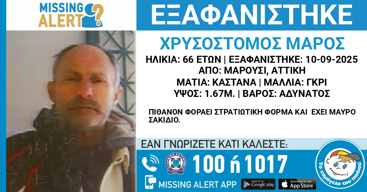 Στις 10/09/2025 πρωινές ώρες, εξαφανίστηκε από την περιοχή του Αμαρουσίου, Αττικής ο Χρυσόστομος (ον.) Μάρος (επ.), 66 ετών. «Το Χαμόγελο του Παιδιού» ενημερώθηκε στις 23/10/2025 για την εξαφάνιση του και προχώρησε στη δημοσιοποίηση των στοιχείων του Χρυσόστομου Μάρου κατόπιν αιτήματος της οικογένειας του, καθώς ενδέχεται να συντρέχουν λόγοι οι οποίοι θέτουν τη ζωή του σε κίνδυνο.