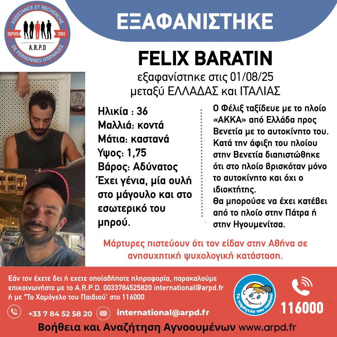 Στις 31/07/2025, βραδινές ώρες, ο Φέλιξ Μπαρατίν, 36 ετών, γαλλικής καταγωγής, επιβιβάστηκε σε πλοίο ΑΚΚΑ της γραμμής Πάτρα – Βενετία, με το όχημά του, έκτοτε αγνοείται. Το «Χαμόγελο του Παιδιού» ενημερώθηκε για την εξαφάνιση του και προχώρησε στη δημοσιοποίηση των στοιχείων του ενήλικου, κατόπιν αιτήματος του φορέα A.R.P.D. (Assistance et Recherche de Personnes Disparues) από τη Γαλλία, καθώς ενδέχεται να συντρέχουν λόγοι, οι οποίοι θέτουν τη ζωή του σε κίνδυνο. Υπάρχει ενδεχόμενο να αποβιβάστηκε στην Ηγουμενίτσα.