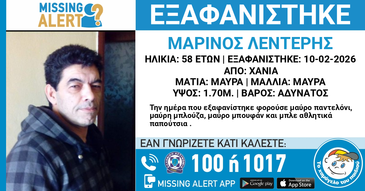 Στις 10/02/2026 εξαφανίστηκε ο Μαρίνος Λέντερης, 58 ετών, από την περιοχή των Χανίων. «Το Χαμόγελο του Παιδιού» ενημερώθηκε σήμερα 13/02/2026 για την εξαφάνιση του Μαρίνου Λέντερη και προχώρησε άμεσα στη δημοσιοποίηση των στοιχείων του ενήλικου κατόπιν αιτήματος των οικείων του, καθώς ενδέχεται να συντρέχουν λόγοι οι οποίοι θέτουν τη ζωή του σε κίνδυνο.