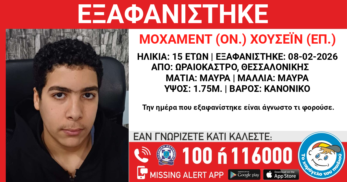 Στις 08/02/2026, απογευματινές ώρες, εξαφανίστηκε από χώρο φιλοξενίας ασυνόδευτων ανηλίκων στο Ωραιόκαστρο Θεσσαλονίκης ο Μοχάμεντ (ον) Χουσεΐν (επ), 15 ετών, αιγυπτιακής καταγωγής. Το Χαμόγελο του Παιδιού ενημερώθηκε σήμερα 09/02/2026 και προχώρησε άμεσα σε δημοσιοποίηση των στοιχείων, κατόπιν εισαγγελικής εντολής, καθώς ενδέχεται να συντρέχουν λόγοι οι οποίοι θέτουν την ζωή του σε κίνδυνο