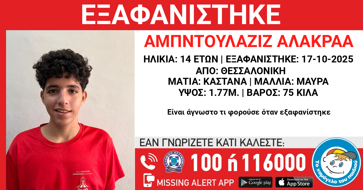 Στις 17/10/25 και ώρα 10:30 πμ, εξαφανίστηκε από χώρο φιλοξενίας στη περιοχή του Ωραιοκάστρου Θεσσαλονίκης ο (όν.) Αμπντουλαζίζ (επ.) Αλακραά, 14 ετών, Αιγυπτιακής καταγωγής. Το «Χαμόγελο του Παιδιού» ενημερώθηκε σήμερα, 18/10/2025, για την εξαφάνισή του και προχώρησε άμεσα στη δημοσιοποίηση των στοιχείων του, καθώς ενδέχεται να συντρέχουν λόγοι που θέτουν τη ζωή του σε κίνδυνο.