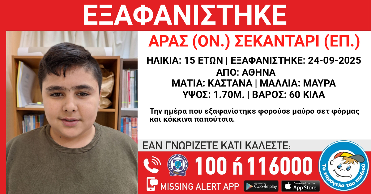 Στις 24/09/2025 και ώρα 20:30 εξαφανίστηκε από την περιοχή της Αθήνας ο Σεκαντάρι / Sekadary (επ.) Αράς / Arash (ον.), 15 ετών, αφγανικής καταγωγής. Το «Χαμόγελο του Παιδιού» ενημερώθηκε σήμερα 14/10/2025 για την εξαφάνισή του και προχώρησε άμεσα στη δημοσιοποίηση των στοιχείων του, κατόπιν εισαγγελικής εντολής, καθώς ενδέχεται να συντρέχουν λόγοι που θέτουν τη ζωή του σε κίνδυνο.