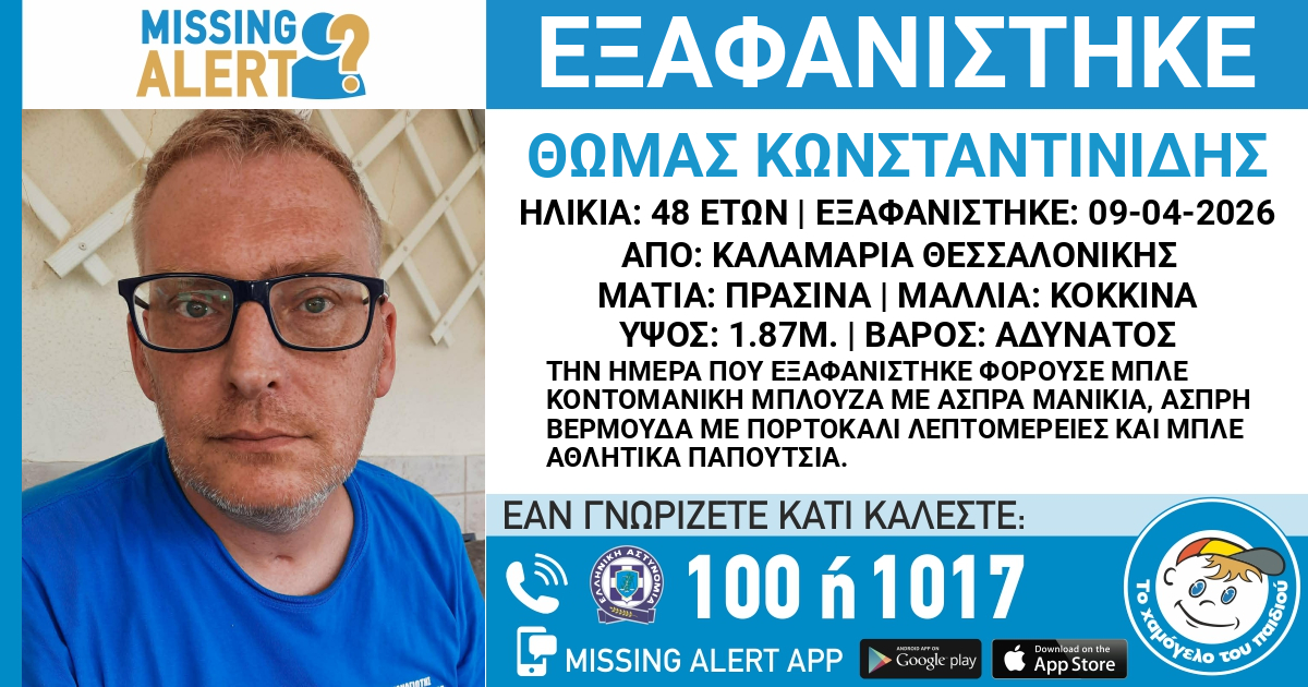 Στις 9 Απριλίου 2026, εξαφανίστηκε από την περιοχή της Καλαμαριάς στη Θεσσαλονίκη ο Θωμάς Κωνσταντινίδης, 48 ετών. Το «Χαμόγελο του Παιδιού» ενημερώθηκε για την εξαφάνιση του και προχώρησε, κατόπιν αιτήματος της οικογένειάς του, στη δημοσιοποίηση των στοιχείων του, καθώς ενδέχεται να συντρέχουν λόγοι, οι οποίοι θέτουν τη ζωή του σε κίνδυνο.
