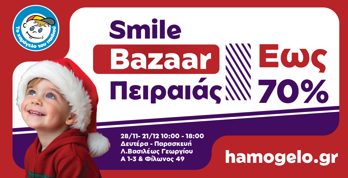Στο Χριστουγεννιάτικο Smile Bazaar θα βρείτε μία τεράστια συλλογή από υπέροχα επώνυμα ρούχα, παπούτσια, μοναδικά αξεσουάρ, παιχνίδια για όλες τις ηλικίες, καλλυντικά, ευφάνταστα χριστουγεννιάτικα είδη -και πολλά ακόμα να ανακαλύψετε-  σε πολύ χαμηλές τιμές, έως -70%!